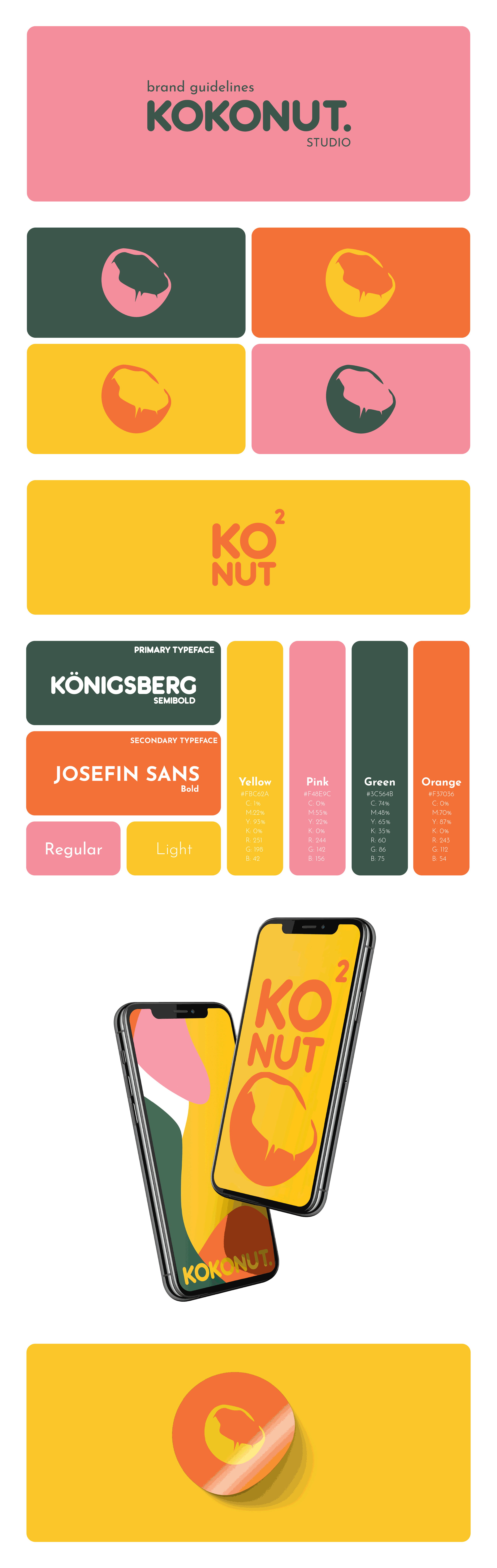 For Kokonut Studio, I created a vibrant and bold brand identity that reflects the playful, fun, and creative personality of the studio. With bright colors and a unique, friendly tone, the branding captures the studio's essence, specializing in design services like branding and photography for businesses seeking a distinctive and personable approach.